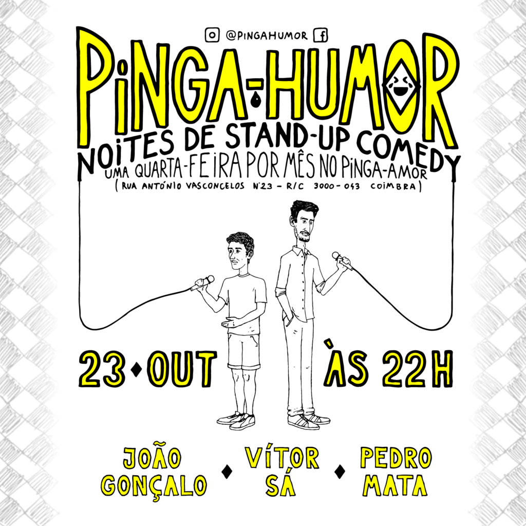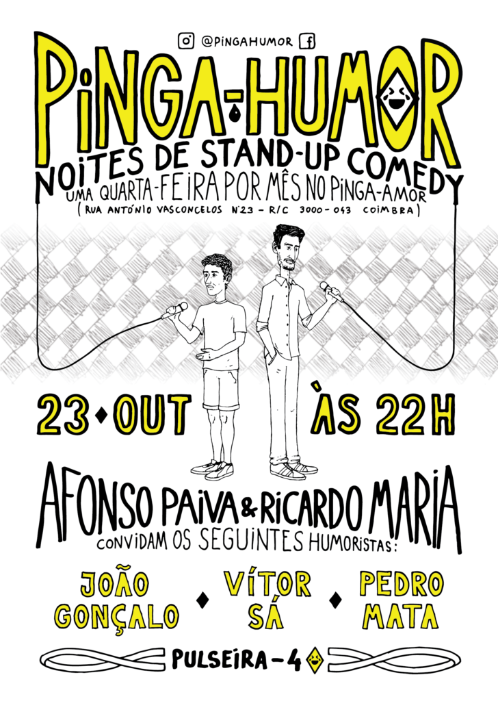 No ano lectivo de 2019/2020 decidi continuar a dinamizar a área da stand-up comedy em Coimbra. Na presente temporada, estou a organizar noites mensais de humor com outro colega humorista (Ricardo Maria) e juntos somos responsáveis pela programação e organização destes espectáculos de comédia. A mudança de espaço (para o bar Pinga Amor), significou uma mudança de conceito e, consequentemente, uma mudança de imagem. Utilizei os meus conhecimentos de designer para desenvolver um cartaz e linguagem gráfica destes eventos de humor. Tentei comunicar o evento de forma apelativa utilizando um estilo de cartaz ilustrado, com desenhos da minha autoria. Tenho recebido boas apreciações.